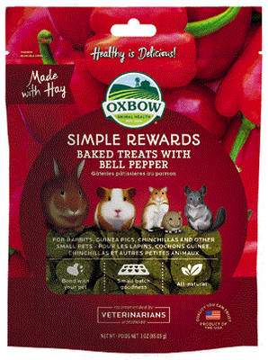 Made with flavourful red peppers and wholesome, high fibre Timothy hay, Simple Rewards Baked Treats with Bell Pepper are a delicious snack pets love. Feed Oxbow treats to add variety and enrichment to your pet’s diet. Size: 85g