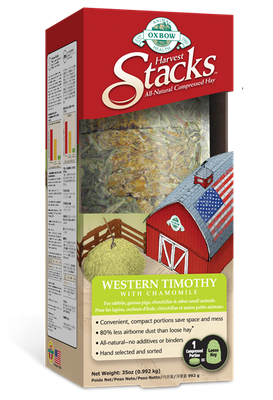 The classic Stack with a calming, herbal twist. Oxbow’s Harvest Stacks – Western Timothy with Chamomile features all-natural Western Timothy Hay in an innovative, enriching format. The addition of chamomile makes this product impossible for rabbits, guinea pigs and other small herbivores to resist. Feed Harvest Stacks as a primary hay source or supplement with loose hay to encourage enrichment. Harvest Stacks make a great feeding option when traveling or anytime storage space is limited. Size: 1kg