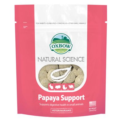 Natural Science Papaya Support promotes overall digestive health in small animals. Papaya and pineapple are natural sources of active digestive enzymes, Papain and Bromelain, respectively. Size: 33g bag